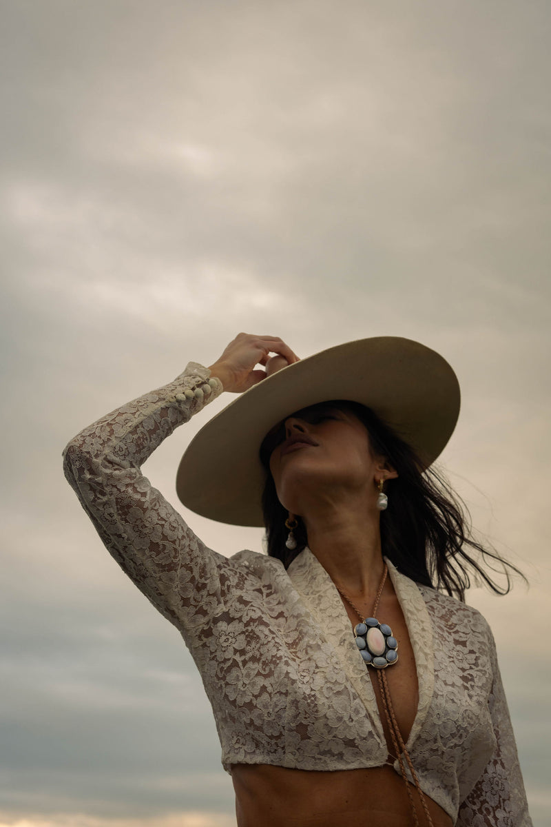 Make a statement with this Blue Lace Agate and Pink Conch bolo tie! Stones are set in fine and sterling silver. Featured on a light tan bolo cord with sterling silver machine made tips. Stamped with Daniela Janette and Broken Horse Designs makers marks as this was part of a collaboration!