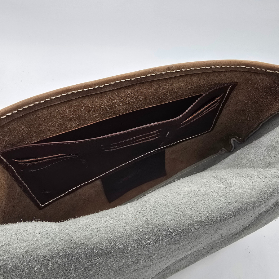 The clutch features a large pocket with multiple card slots and a smaller pocket for your phone. The top is held closed by a magnetic clasp, which is hidden in the leather. There is also a large outside pocket.