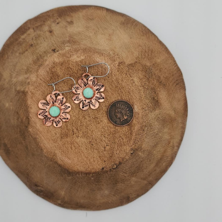 These modern earrings feature lightweight copper and natural New Lander variscite stones. The unique stone shapes are hand stamped and maker marked. The earrings hang on stainless ear wires for long-lasting durability.
