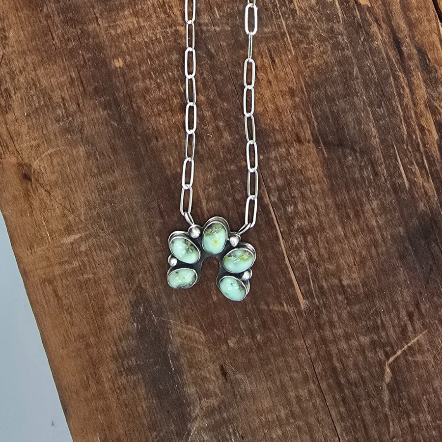 A beautiful Palomino Variscite necklace, perfect for any outfit! The stones feature great hues of colors creating a stunning look. They are set in fine and sterling silver. Featured on an 18.5 - 19 inch Sterling Silver Paperclip chain. The necklace is stamped with my makers mark and stamped sterling.